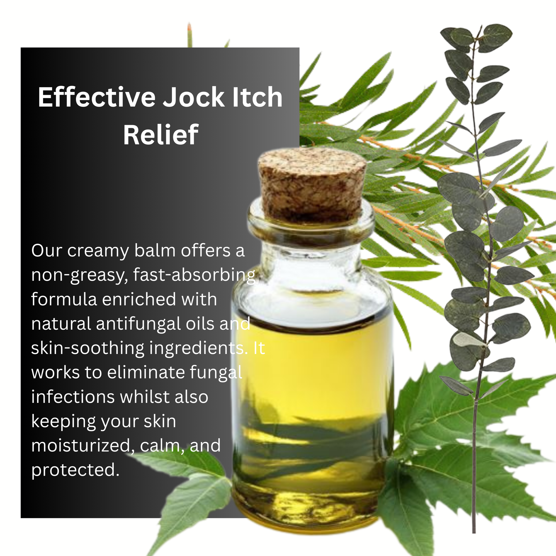 Our creamy balm offers a non-greasy, fast-absorbing formula enriched with natural antifungal oils and skin-soothing ingredients. It works to eliminate fungal infections whilst also keeping your skin moisturized, calm, and protected.